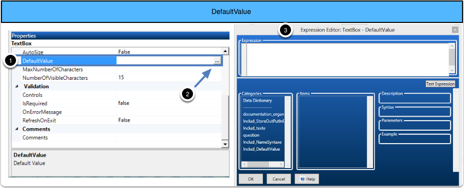 Pour modifier la propriété DefaultValue (1), cliquez sur le bouton qui apparait dans la zone de remplissage (2) puis ajoutez l'expression voulue via l'éditeur d'expression (3)