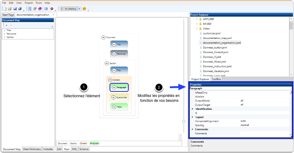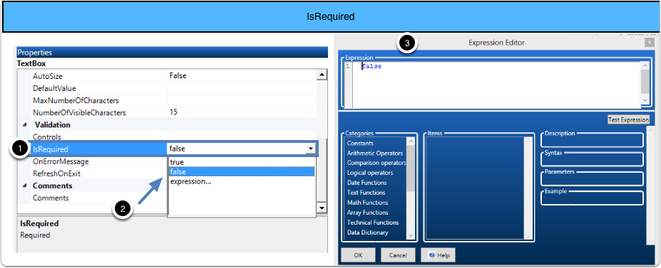Pour modifier la propriété IsRequired (1), sélectionnez l'option voulue (True ou False) dans la liste déroulante (2). L'option "Expression" vous permettra d'ouvrir l'éditeur d'expression.
