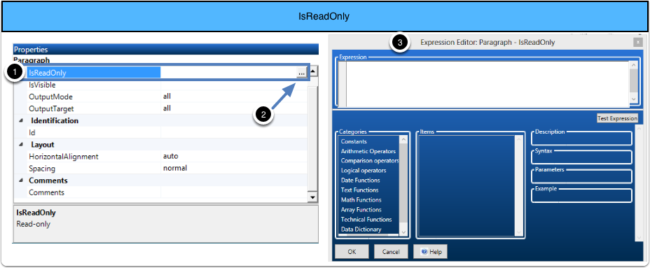 Pour modifier la propriété IsReadOnly (1), cliquez sur le bouton qui apparait dans la zone de remplissage (2) puis ajoutez l'expression voulue via l'éditeur d'expression (3)