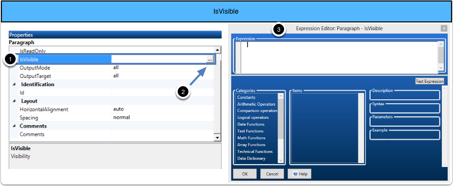 Pour modifier la propriété IsVisible (1), cliquez sur le bouton qui apparait dans la zone de remplissage (2) puis ajoutez l'expression voulue via l'éditeur d'expression (3)