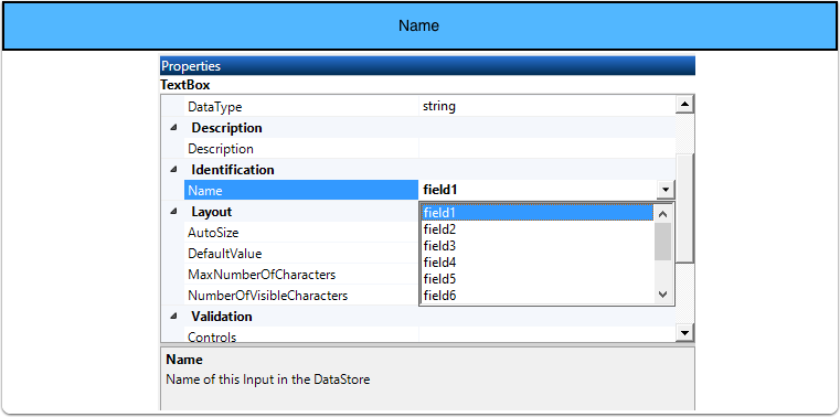 La propriété DefaultValue contient un nom de variable dont la valeur initialise la saisie (champs de saisie vides par défaut)