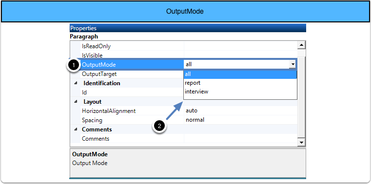 Pour modifier la propriété OutputMode (1), sélectionnez l'option voulue dans la liste déroulante (2)