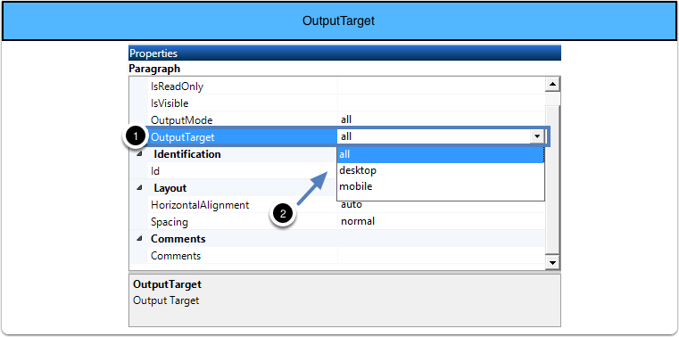 Pour modifier la propriété OutputTarget (1), sélectionnez l'option voulue dans la liste déroulante (2)
