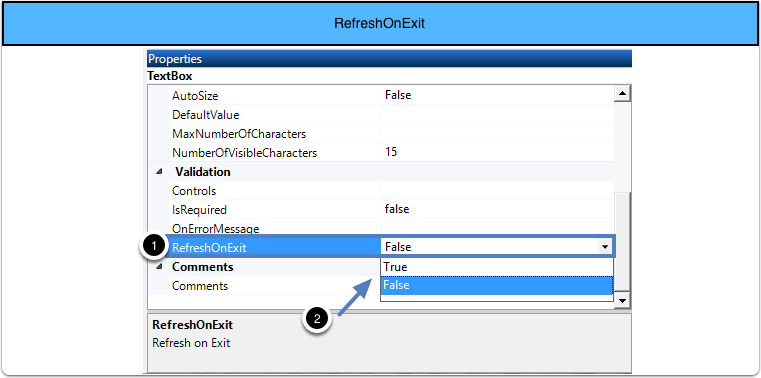 Pour modifier la propriété RefreshOnExit (1), sélectionnez l'option voulue (True ou False) dans la liste déroulante (2).