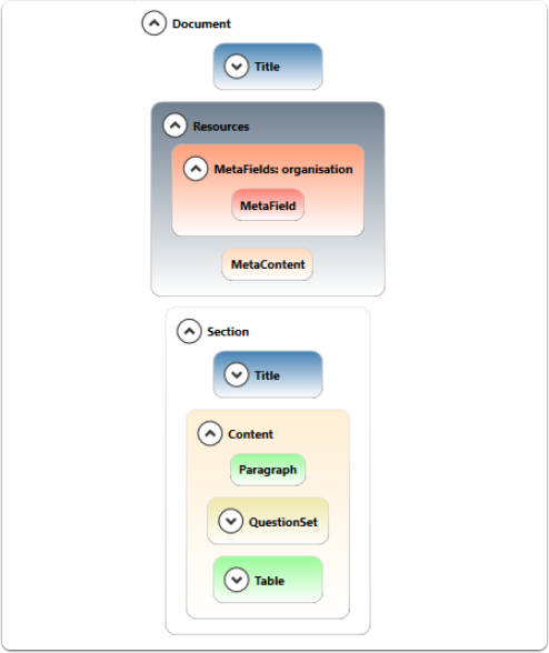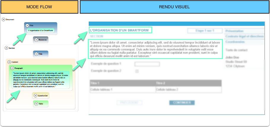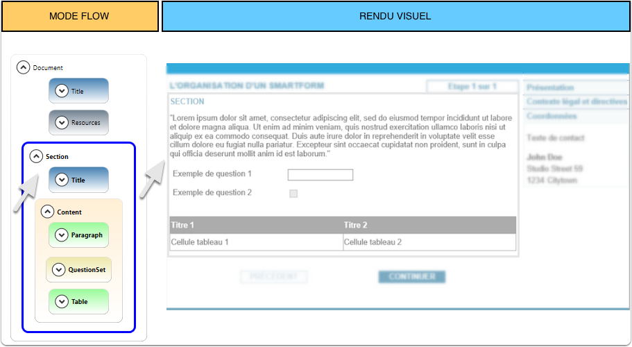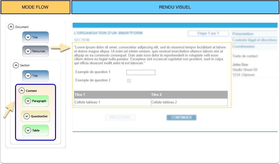 L'élément Content est le bloc standard pouvant contenir un ou plusieurs sous-éléments (Paragraph, List, Table, Questionset, ...)