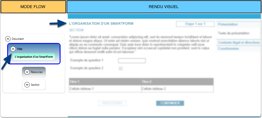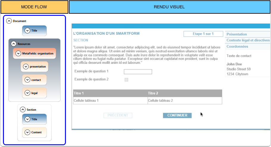 Cette partie de la documentation vous présente les principaux éléments qui composent la monture d'un document généré par FormPublisher Studio. En d'autres termes, cette page reprend les éléments qui forment l'organisation de base d'un SmartForm.